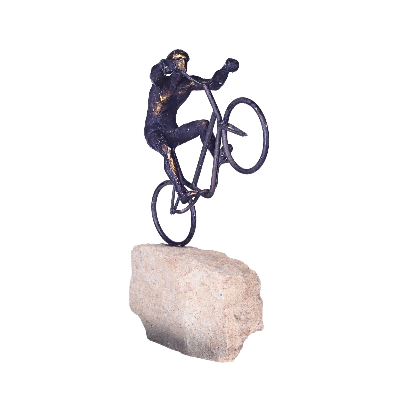 A dynamic 13-inch metal figurine of a cyclist performing a wheelie, mounted on a rugged stone base (7"x2"). This handcrafted piece captures movement and adventure—perfect for modern décor or gifting to cycling enthusiasts.
