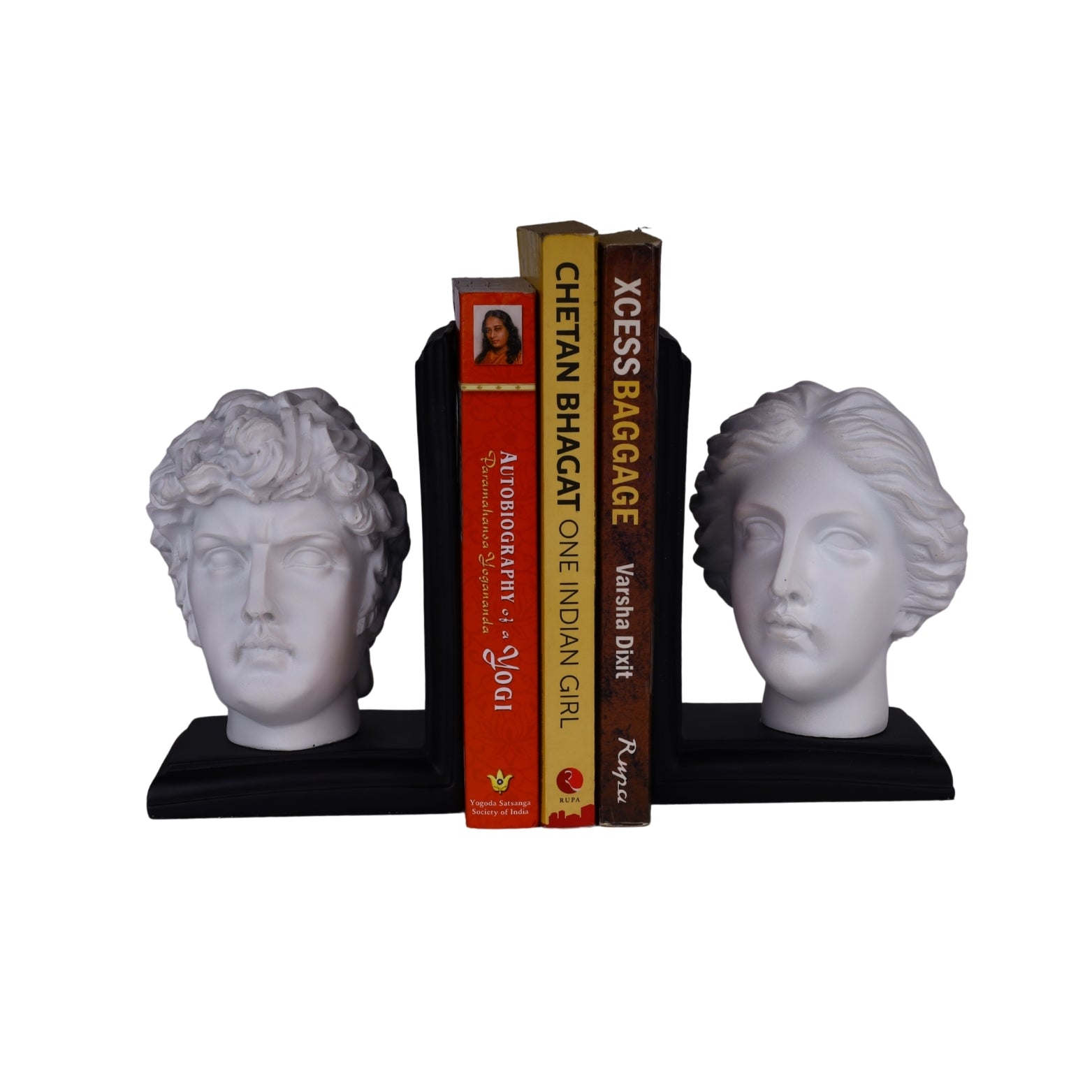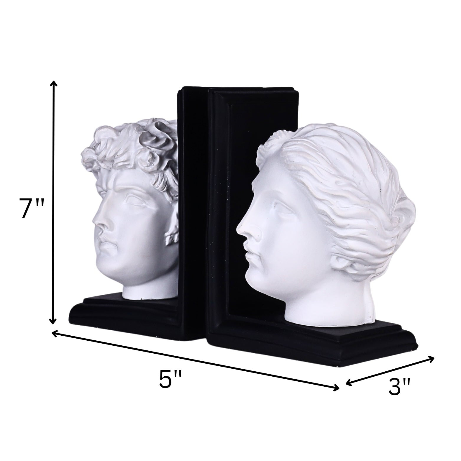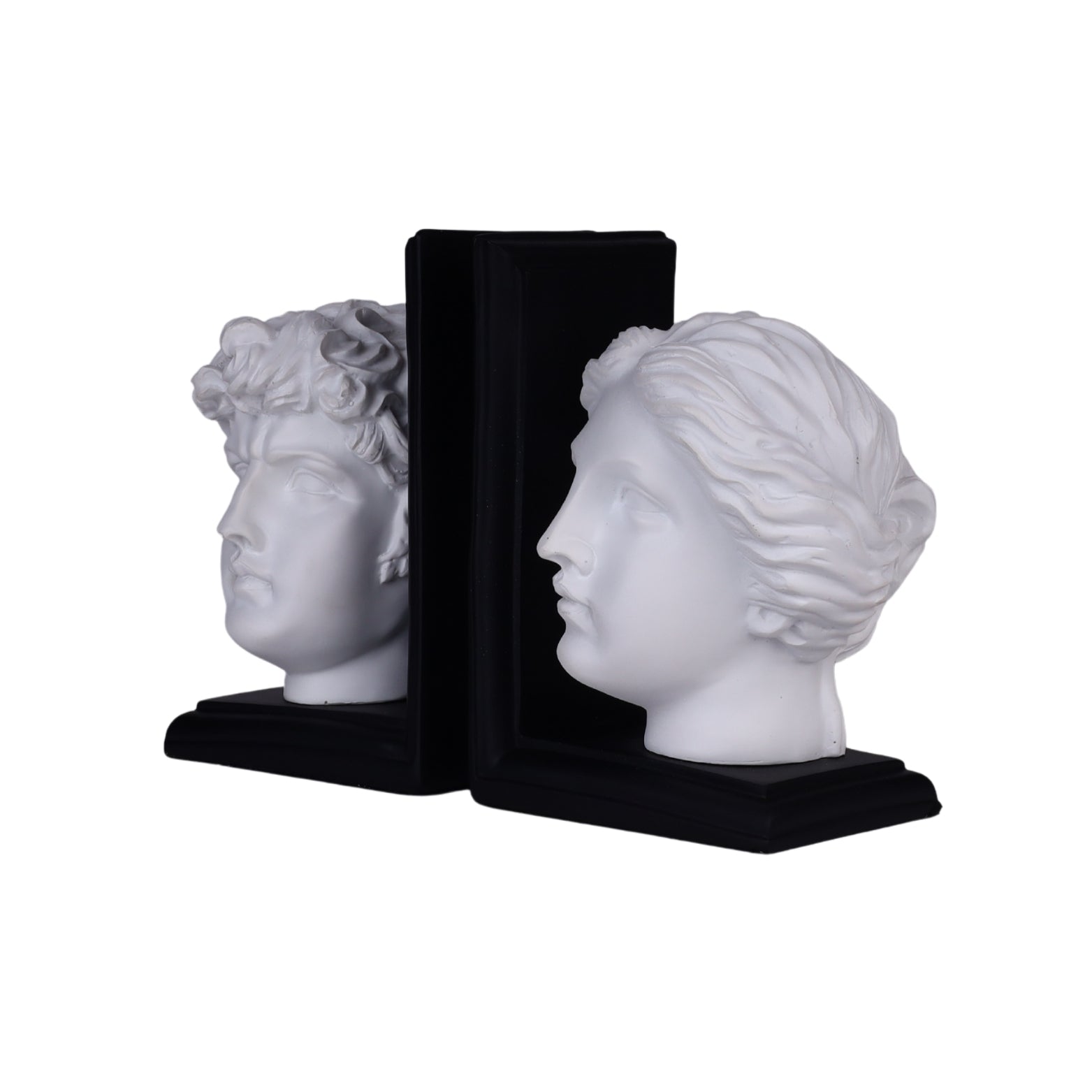A timeless set of Roman-inspired sculptural bookends featuring male and female busts in a white finish on a black base. Ideal for adding elegance and artistic charm to bookshelves, desks, or console displays.