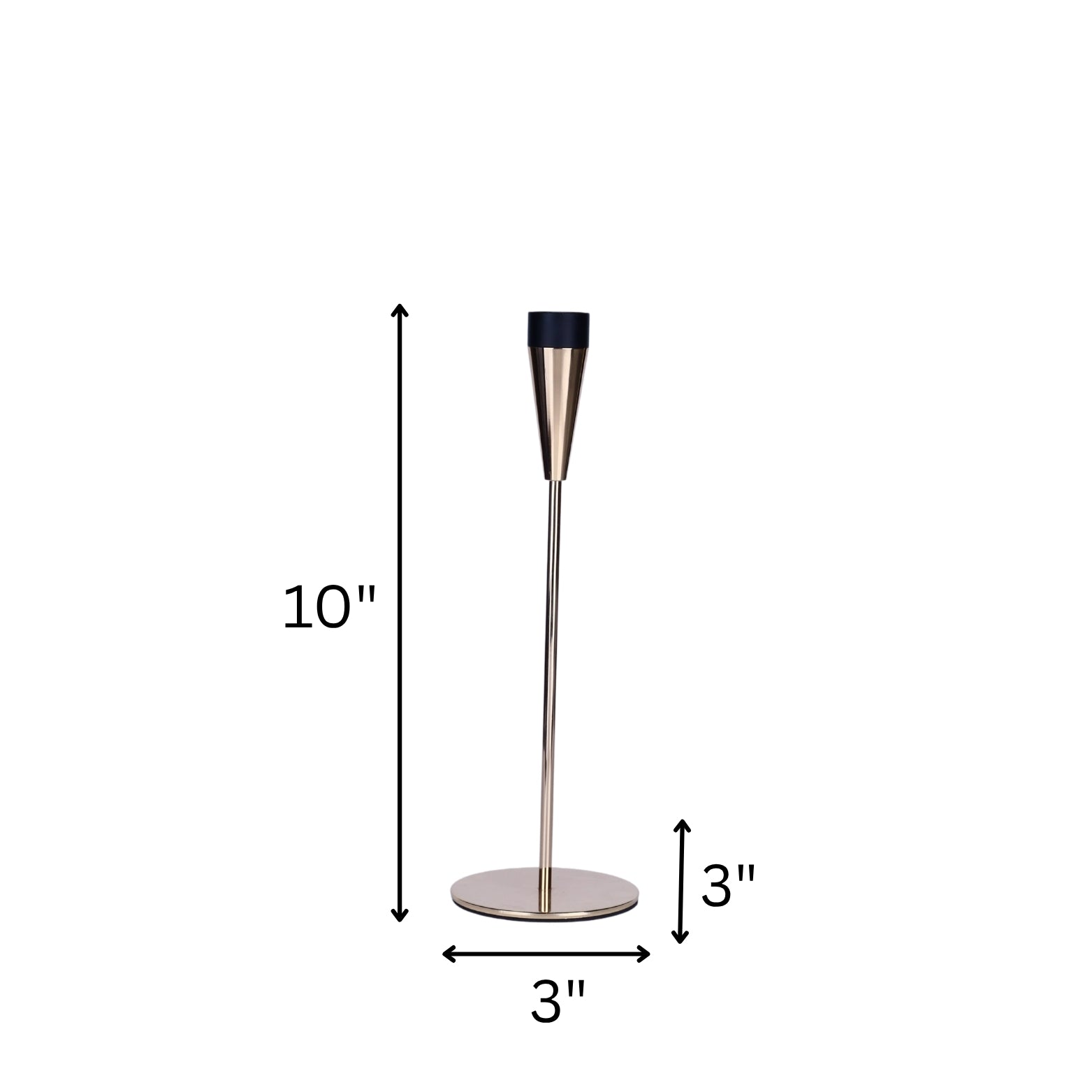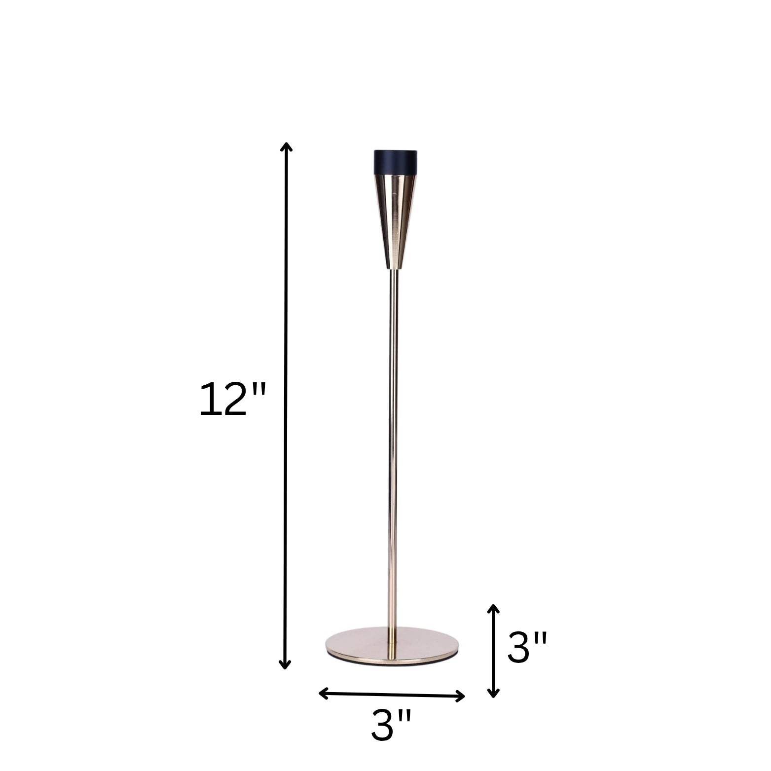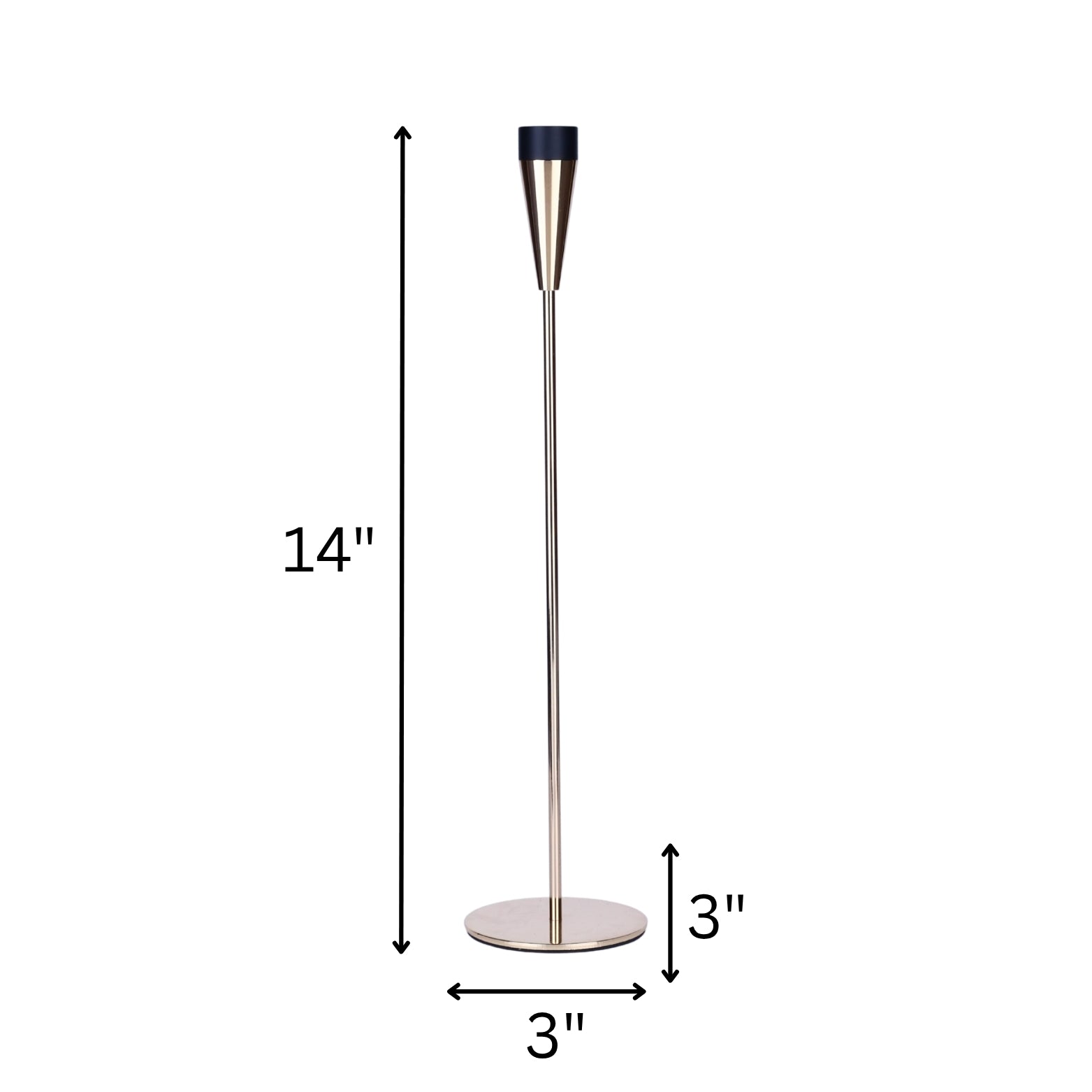 Sleek and elegant metal candle holders in gold with black tops. Set of 3 in varying heights (up to 14"). Perfect for contemporary table centerpieces or shelf décor.