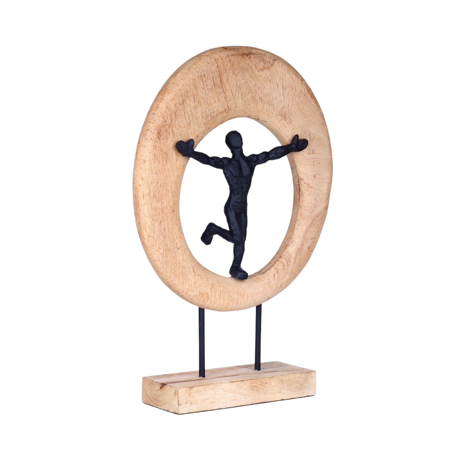 Striking 18" tall figurine of a black metal figure balancing inside a natural wood oval frame. Size: 18" x 8" x 3". A bold symbol of strength, stability, and harmony for modern décor.