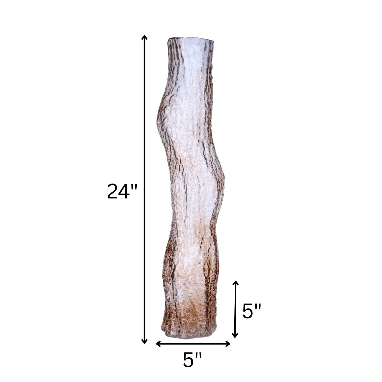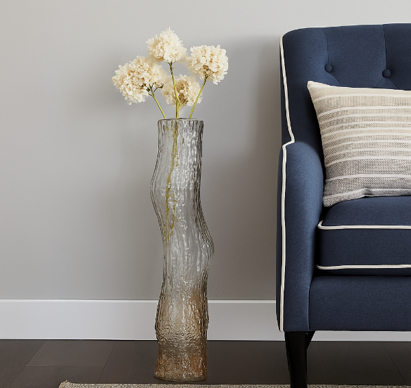 A striking decorative vase featuring a textured ripple surface and graceful organic curves. The soft amber hue and sculptural form make it an elegant accent for modern interiors, perfect for tall floral arrangements or as a standalone statement piece.