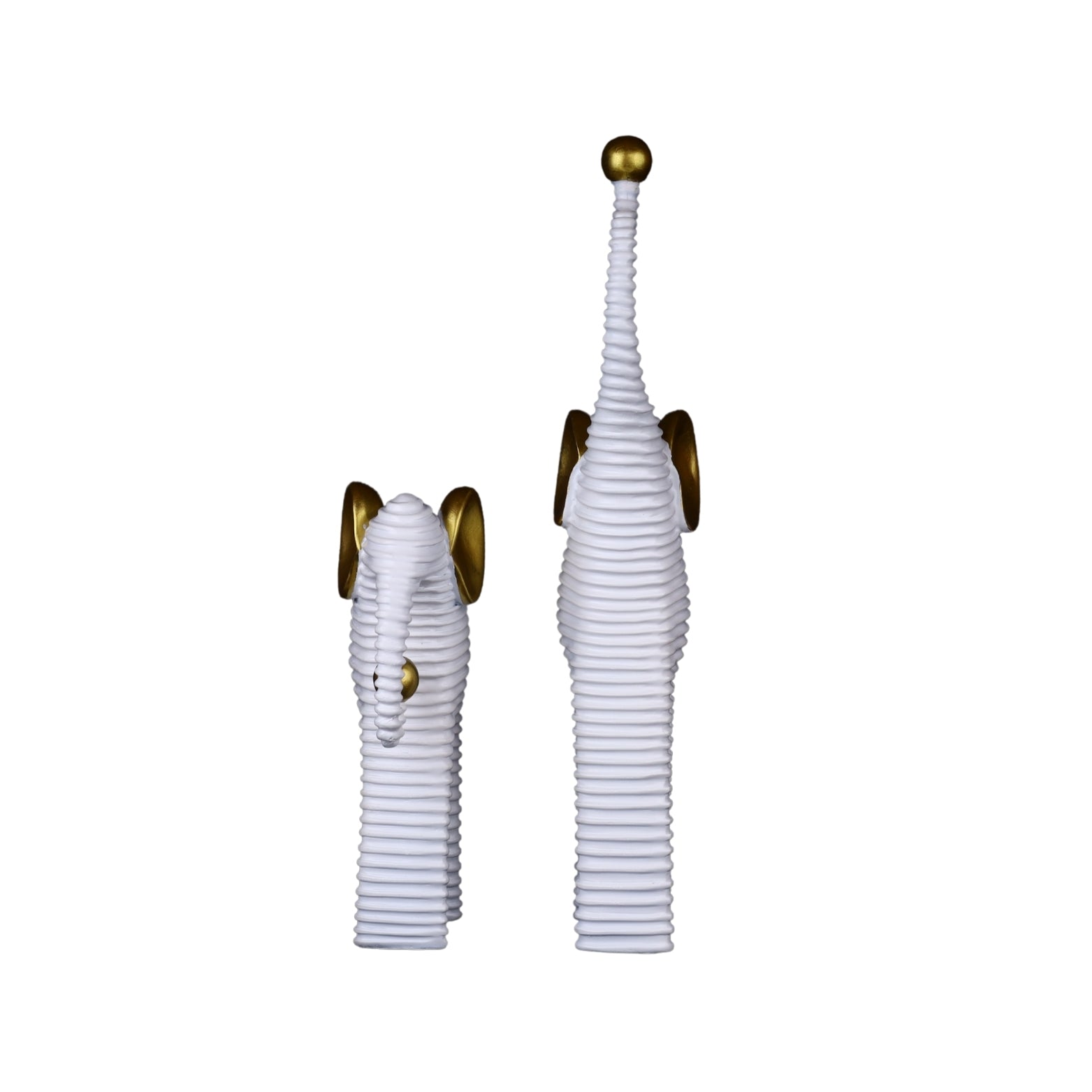 A charming duo of modern elephant sculptures in textured white with golden ears and accents. Symbolizing good luck and harmony, they make the perfect addition to console tables, bookshelves, or entryway décor.